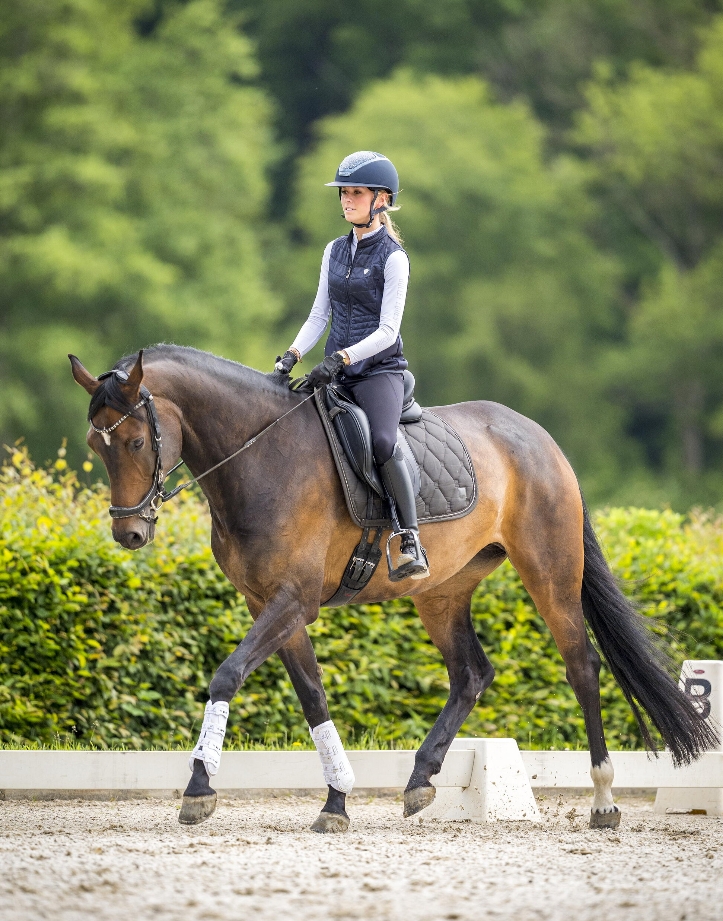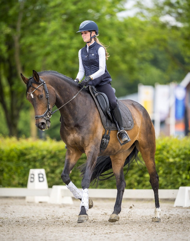 Ten tijde van het maken van het artikel rijdt Dewi Hoeks M1 dressuur met de merrie Karisma. “Ik wil heel graag Z starten, maar soms vraag ik me af of dat niet te veel is voor haar lichaam. Karisma vindt het erg moeilijk om gedragen en gesloten te lopen, vanwege haar lange bovenlijn. Ook is ze wat overbouwd. Tijdens de proef krijgen we vaak het commentaar: ‘valt op de voorhand’, ‘meer gedragenheid’ of ‘paard valt soms uit elkaar’. De laatste tijd heeft Karisma moeite met de galop. De fysiotherapeut gaf aan dat het voor haar lastig is om het bekken te kantelen.” KWPN-inspecteur Floor Dröge bekijkt de merrie eerst zonder zadel. “Ze is achter inderdaad een klein beetje hoger dan dat ze voor is. Daarnaast is de lendenenpartij een beetje strak en mist ze daar wat bespiering.”